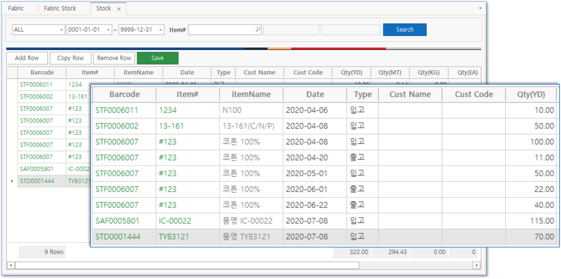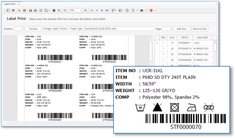 여러 개의 아이템을 선택하여 클릭하면 실시간 재고 확인과 라벨 출력이 가능합니다.