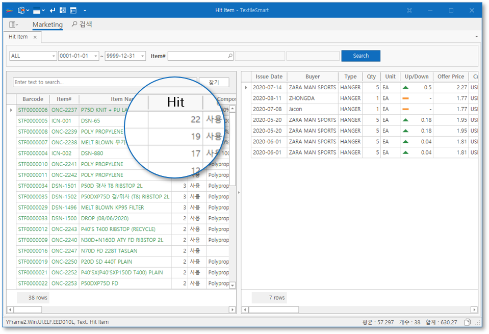 품목별 Best Item을 확인하고 해당 품목이 어떤 바이어와 상담했는지 확인이 가능합니다.
